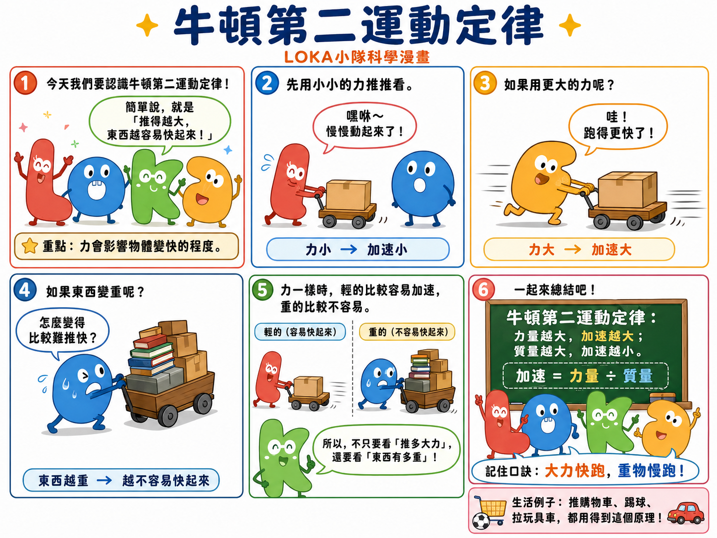 推購物車、踢足球、拉玩具車、騎滑板車、搬箱子,都可以看到牛頓第二運動定律。只要有「用力讓東西動起來或變快」,就很可能跟這個原理有關。